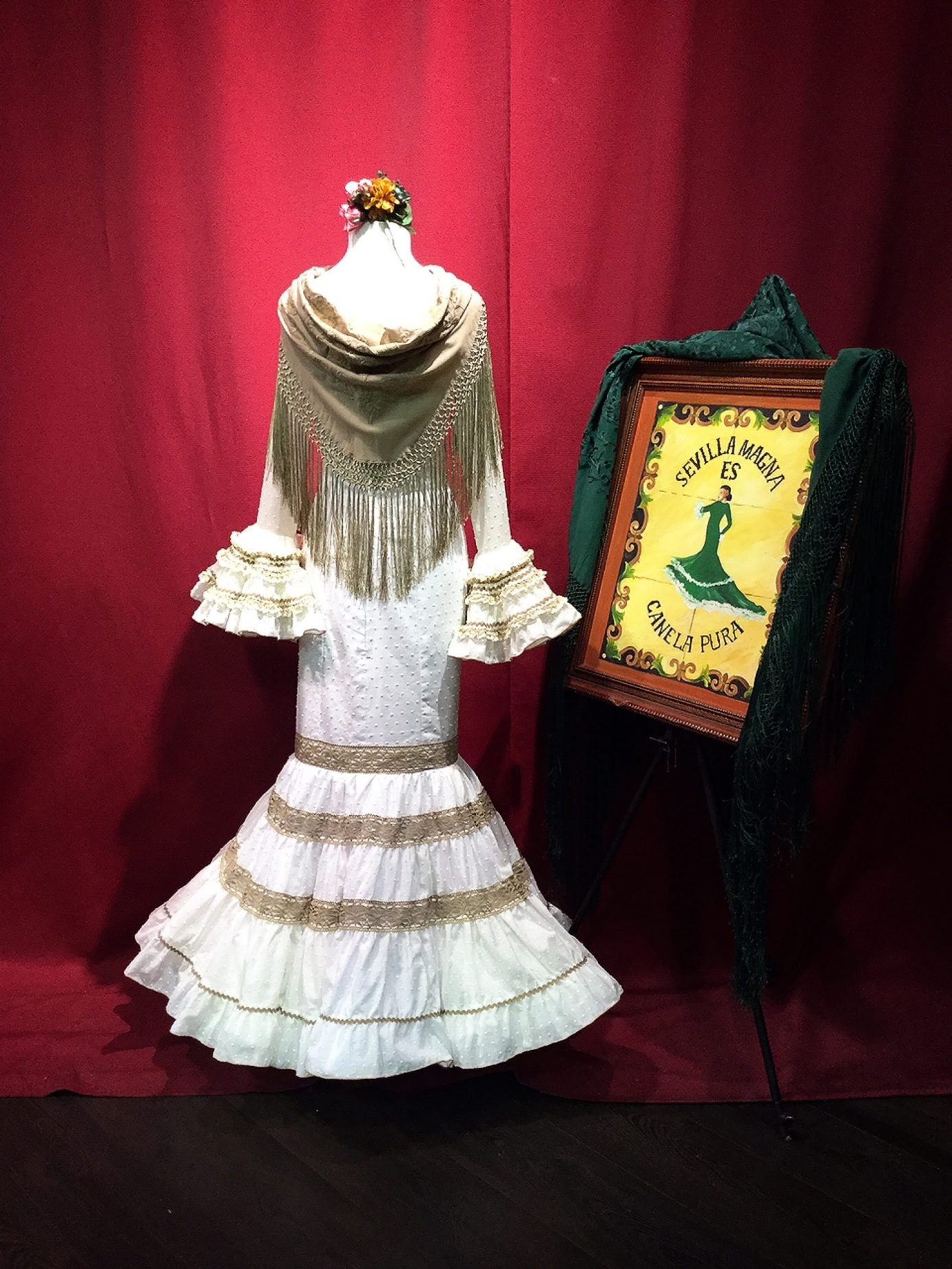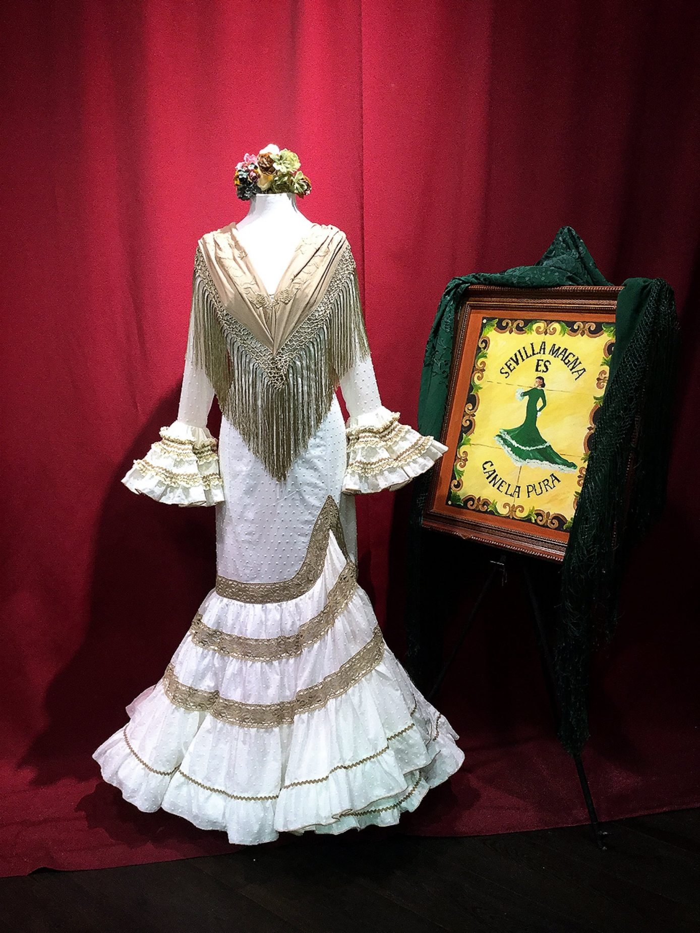 Traje canastero con subida en el talle, confeccionado en plumetti con adornos de encajes. Manga larga con detalles en los volantes. Disponible en varios colores.