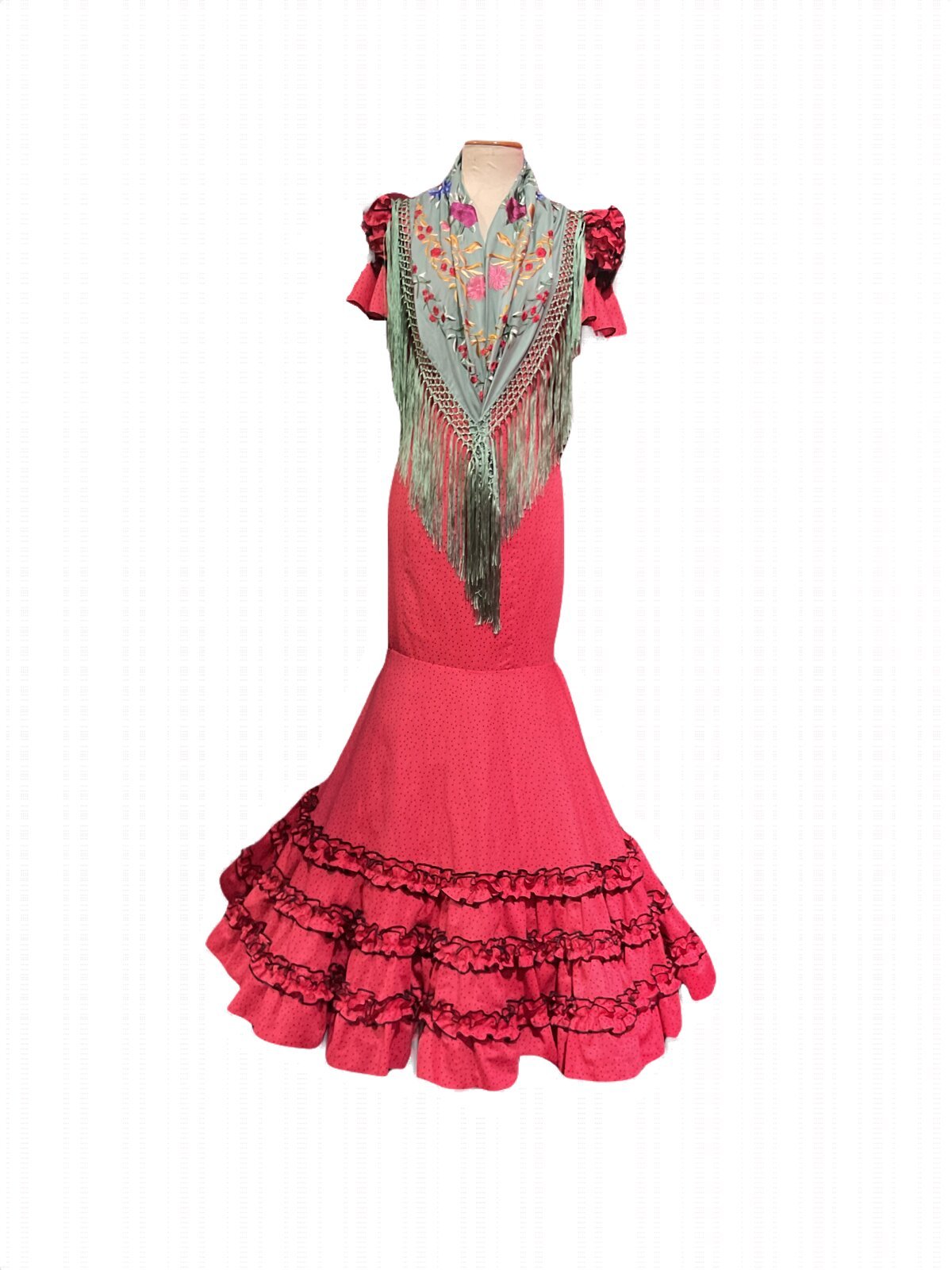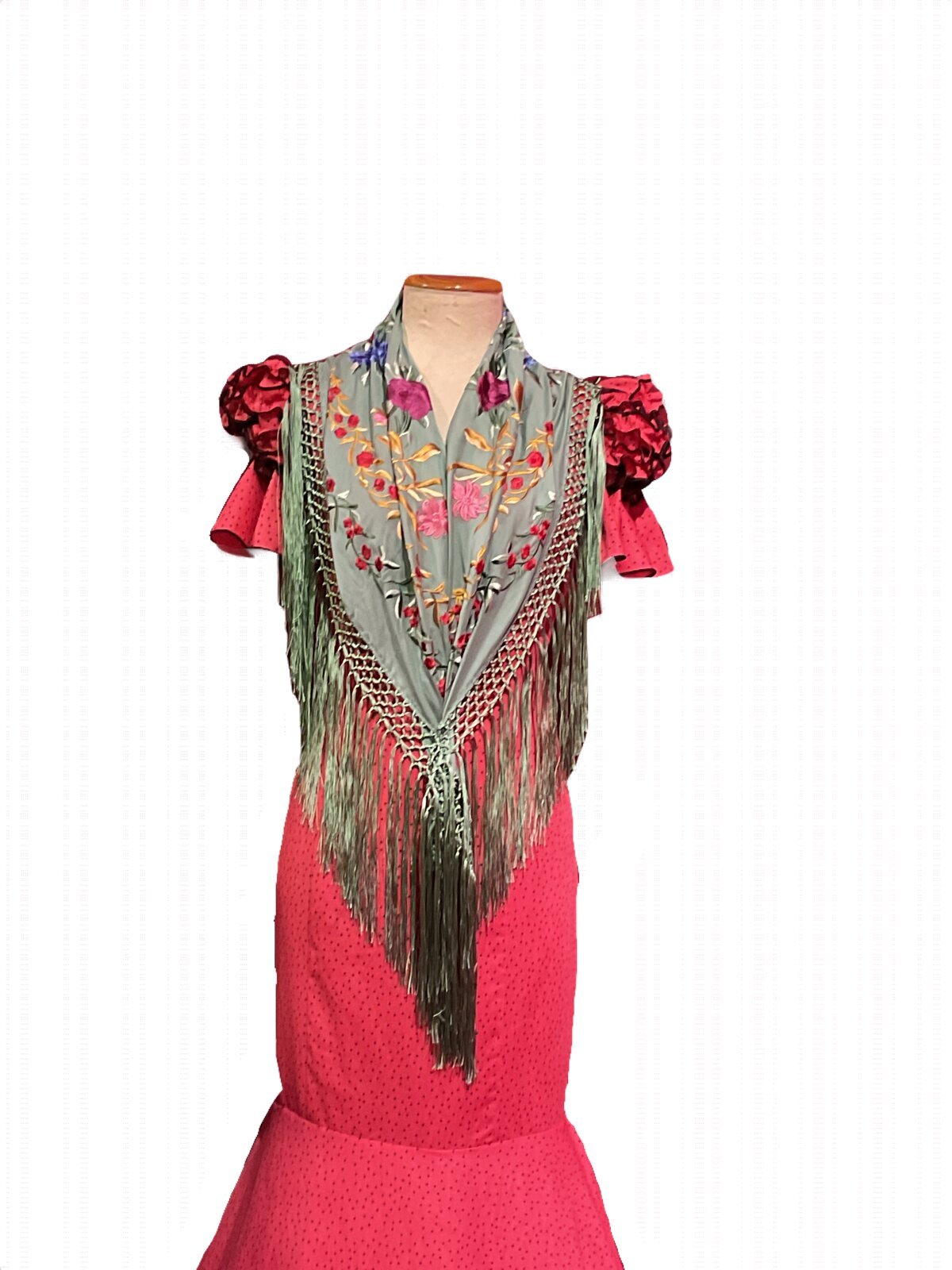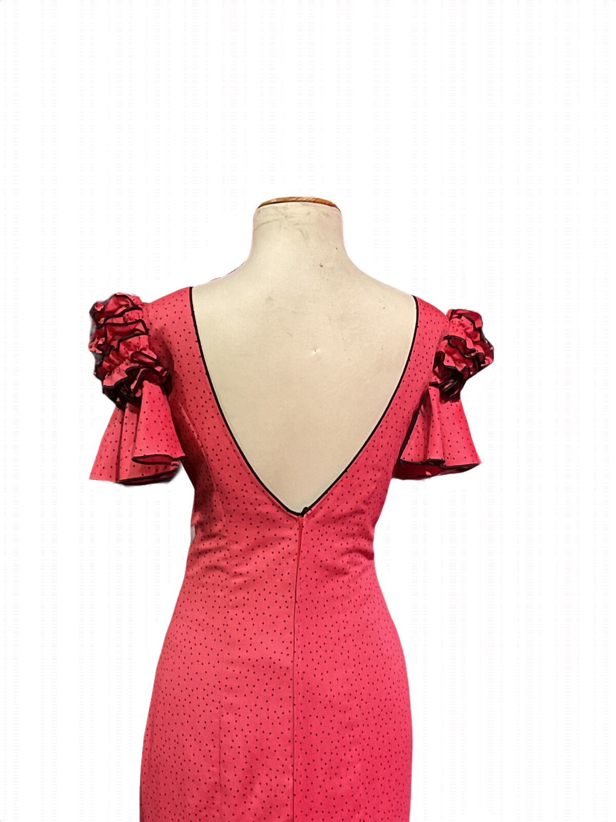 Vestido con corte en el talle, falda canastera con adornos de carruchas. Manga corta con carruchas en el farolito y volante, escotes delantero y trasero de pico.