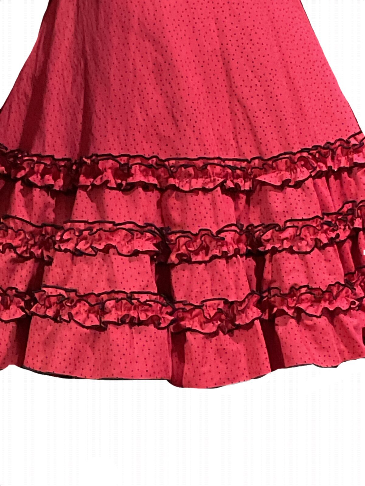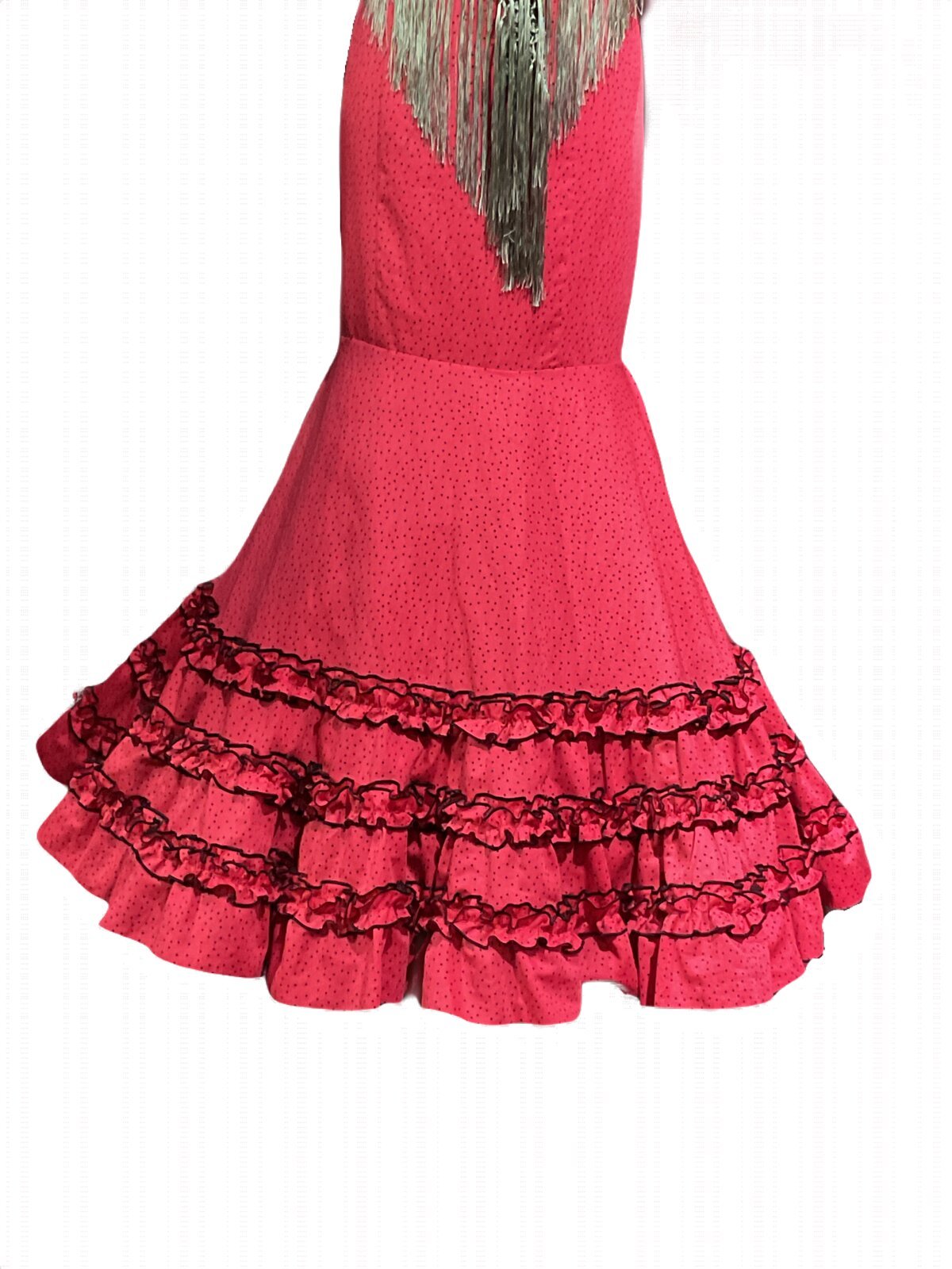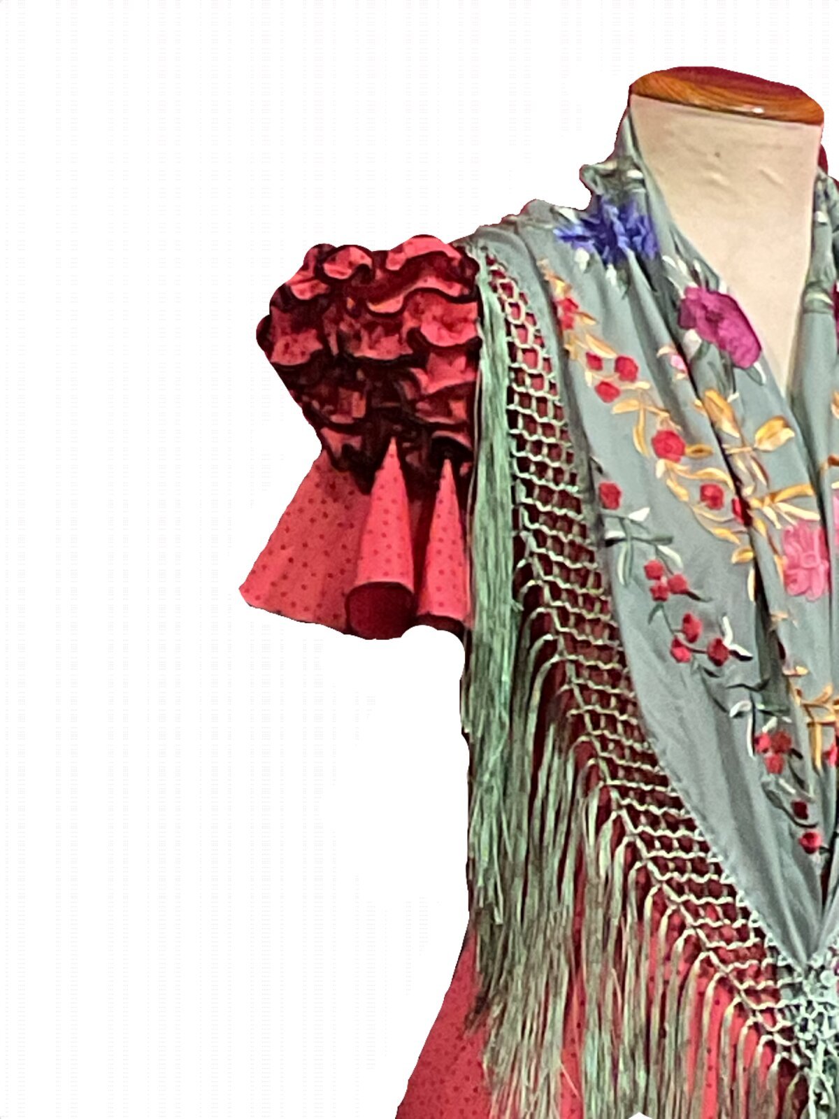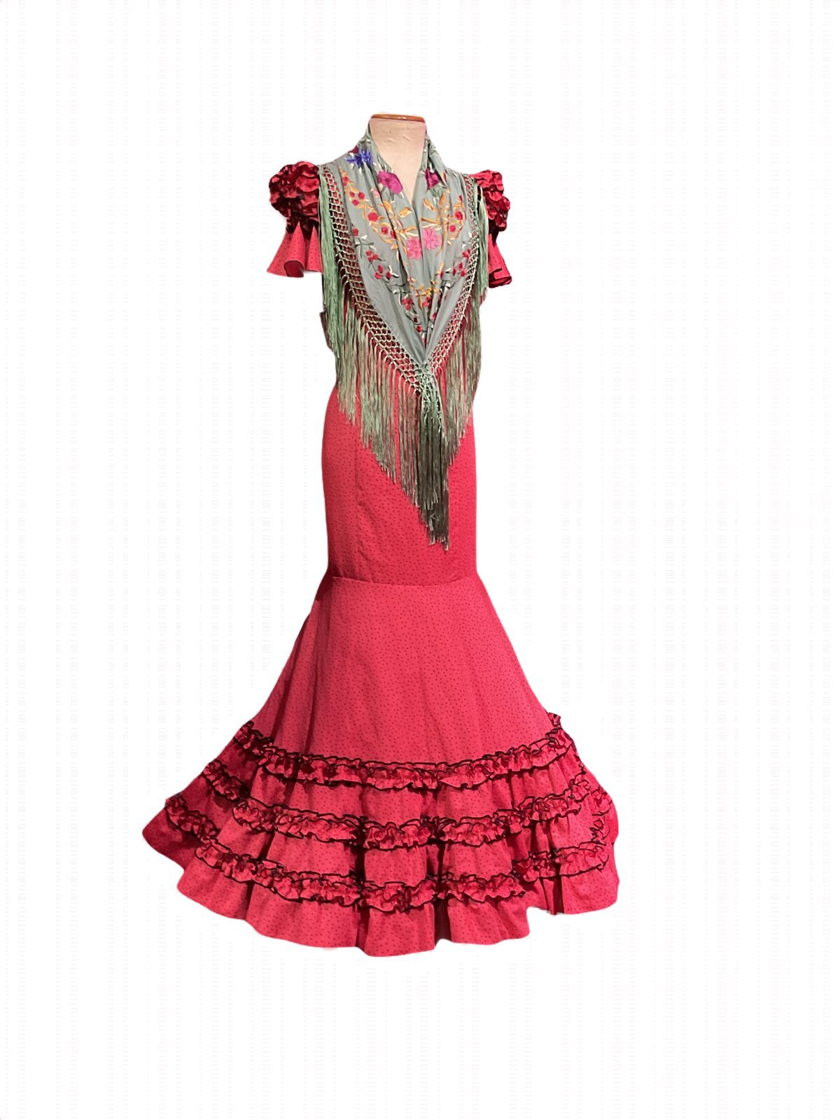 Vestido con corte en el talle, falda canastera con adornos de carruchas. Manga corta con carruchas en el farolito y volante, escotes delantero y trasero de pico.