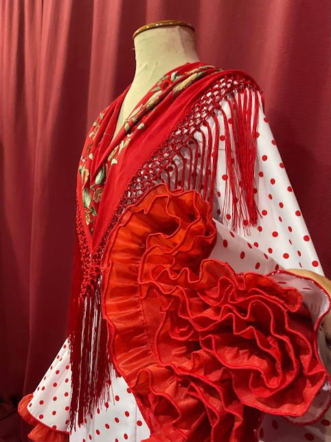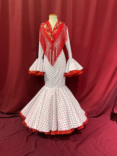 Modelo de capa con varios can can que le da ese volumen en la falda. Manga larga con volantes importantes con can can y adorno luna para elevar y dar movimiento. Escote delantero de pico y trasero bajo.