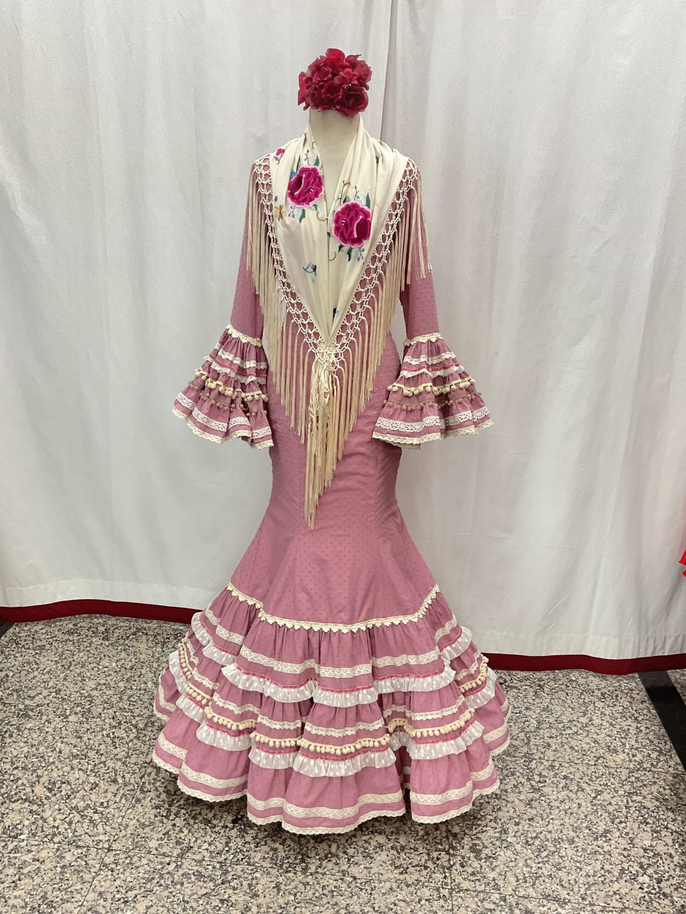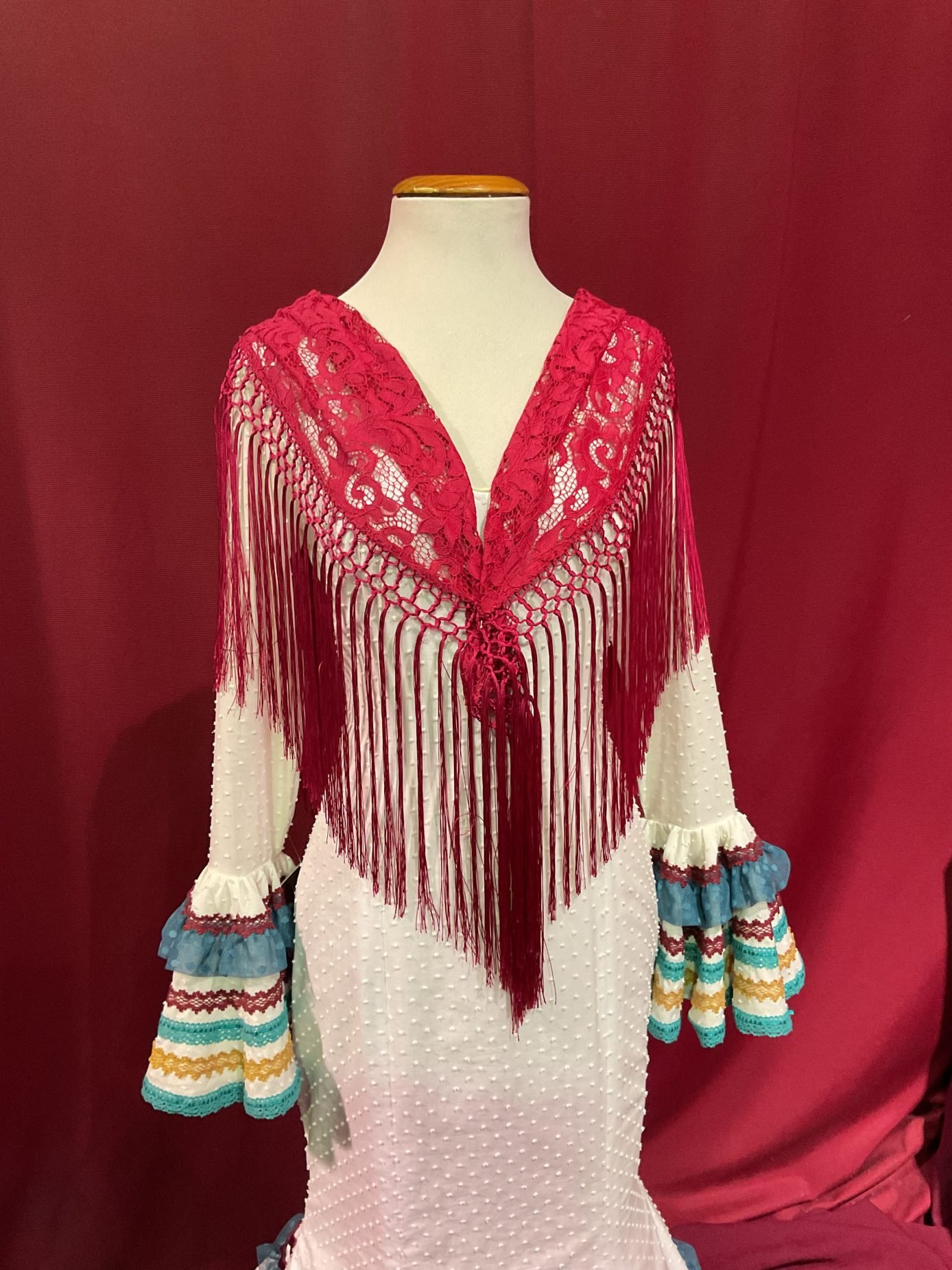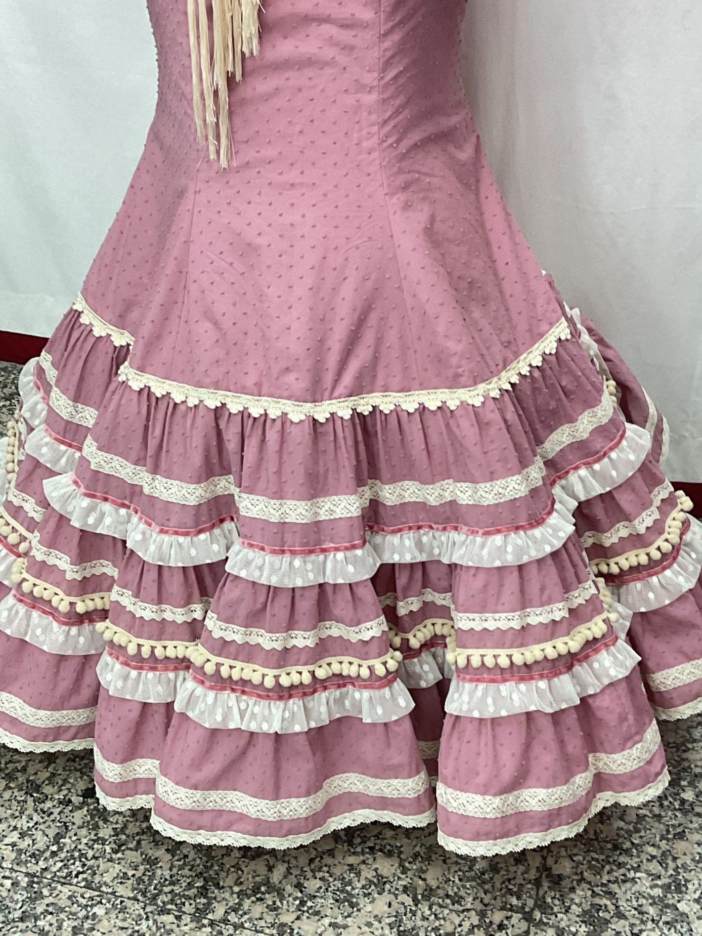 Diseño enterizo con rejas en falda y cortes canasteros, adornado con diferentes fornituras, escotes delantero y trasero de pico. Manga larga y volante similar a falda en el puño.