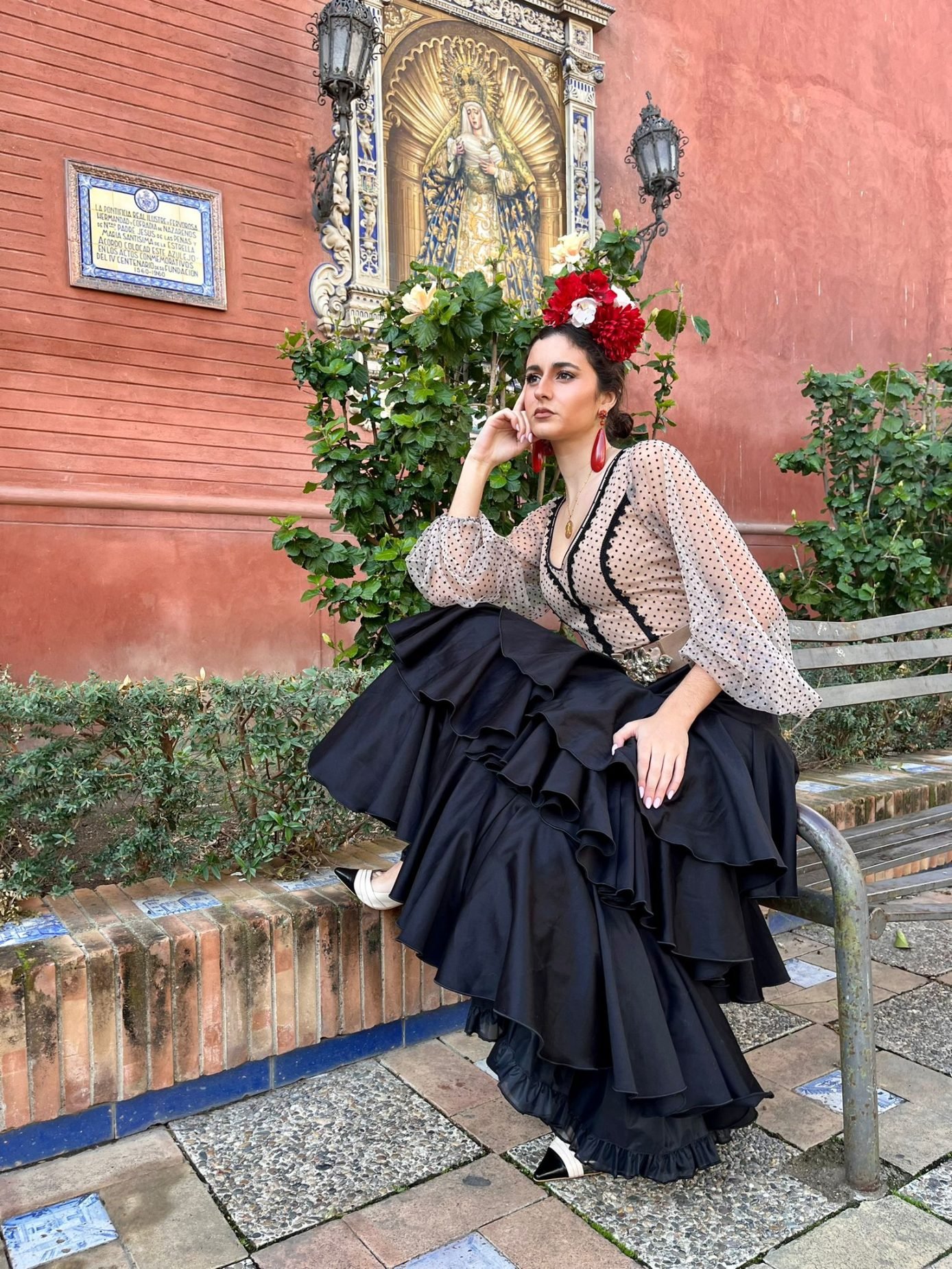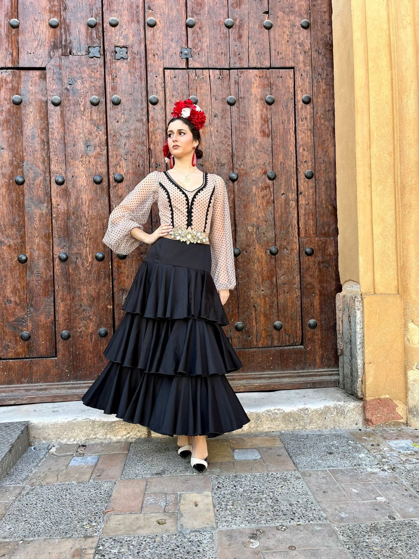 Modelo cortado al talle en la cadera, con tres volantes anchos, disponible en varios colores.