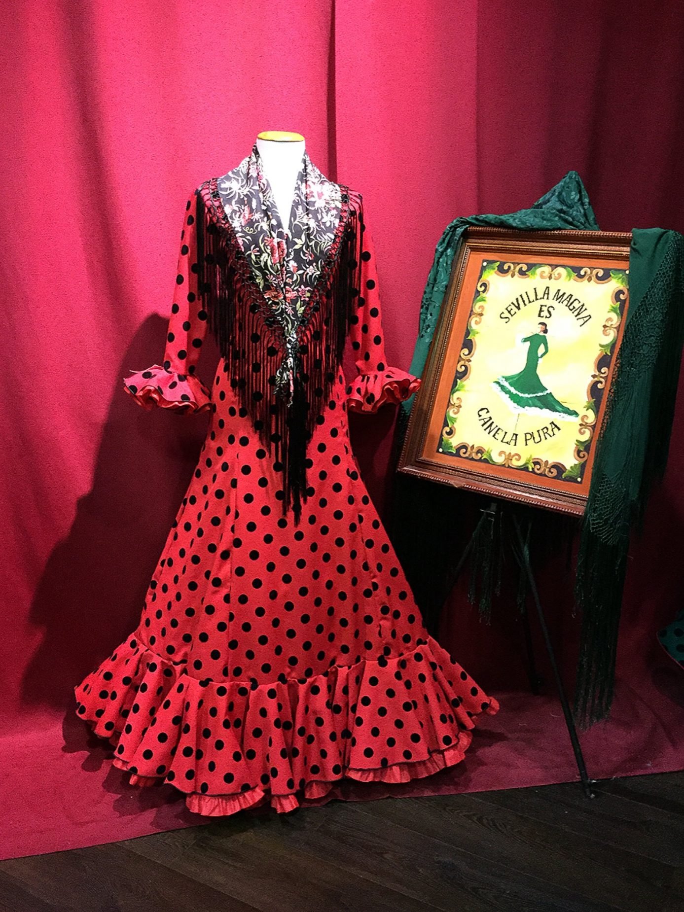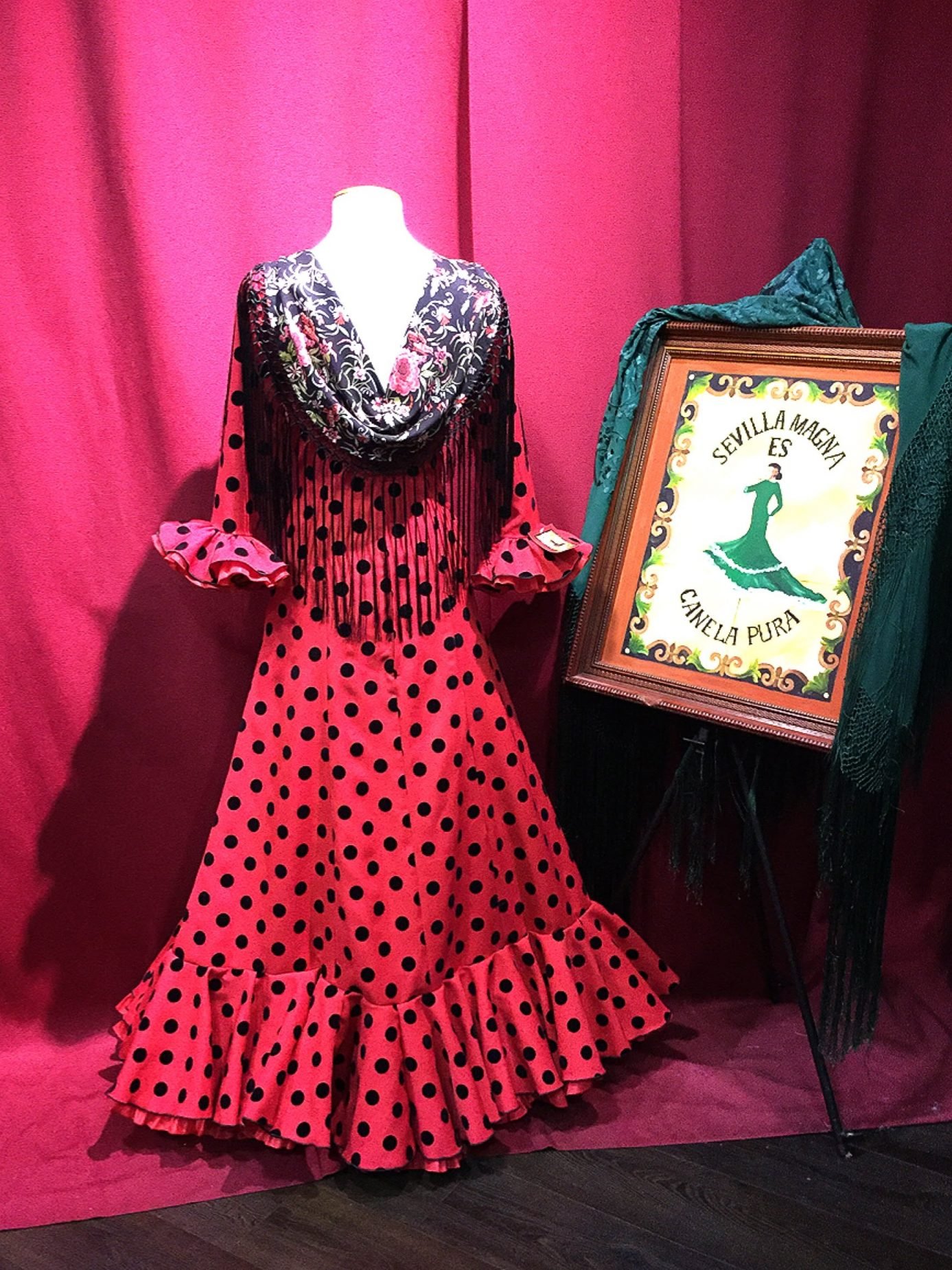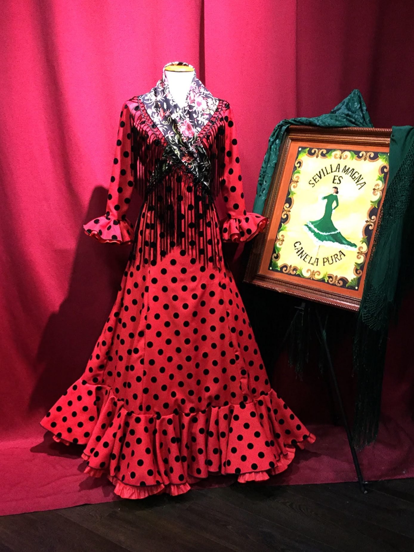 Vestido enterizo con volante en el bajo. Manga larga y volante en los puños, disponible en varios colores. Para ferias y romerías.