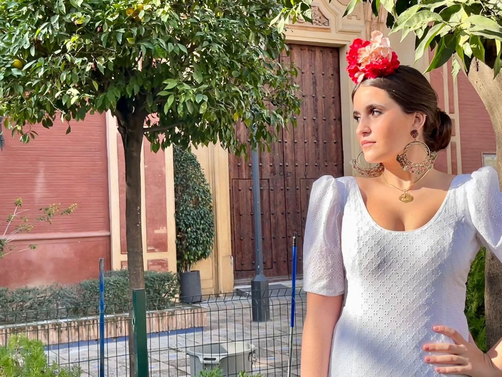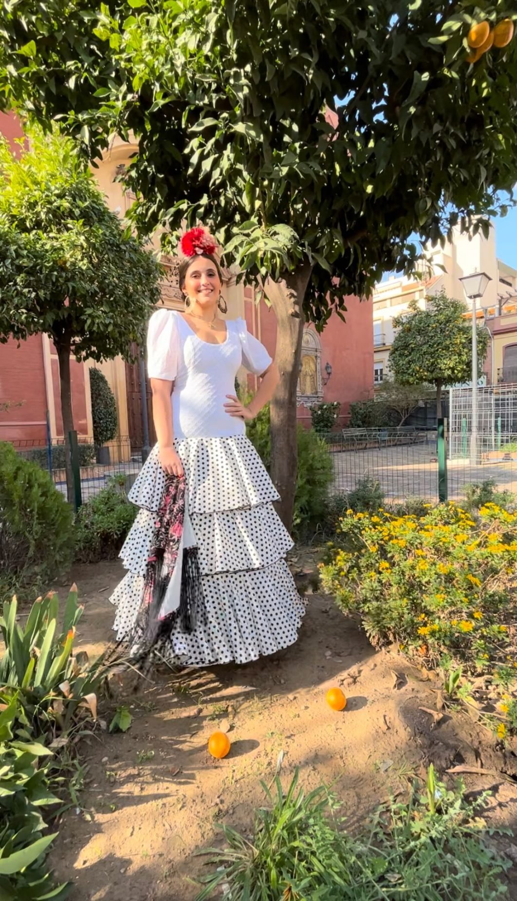 Modelo cortado al talle en la cadera, manga farol , cuerpo combinado perforado y falda de lunares . Ponible tanto en feria como en romerías, disponible en varios colores.