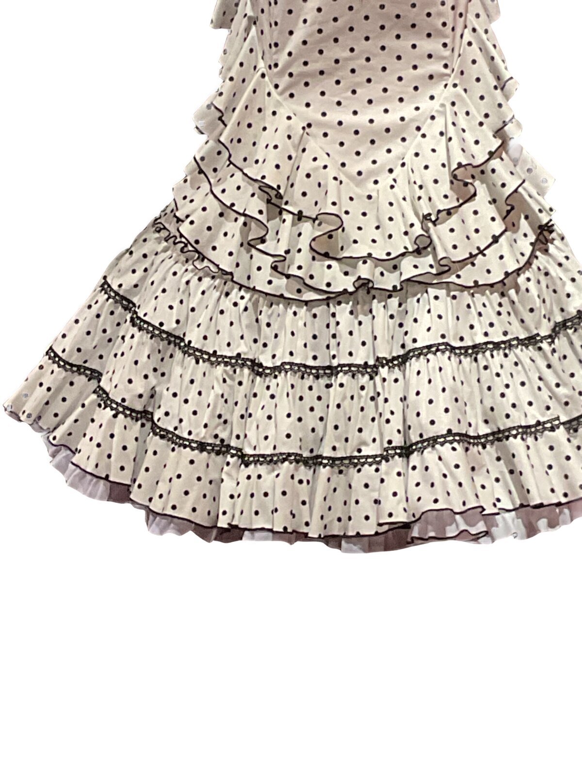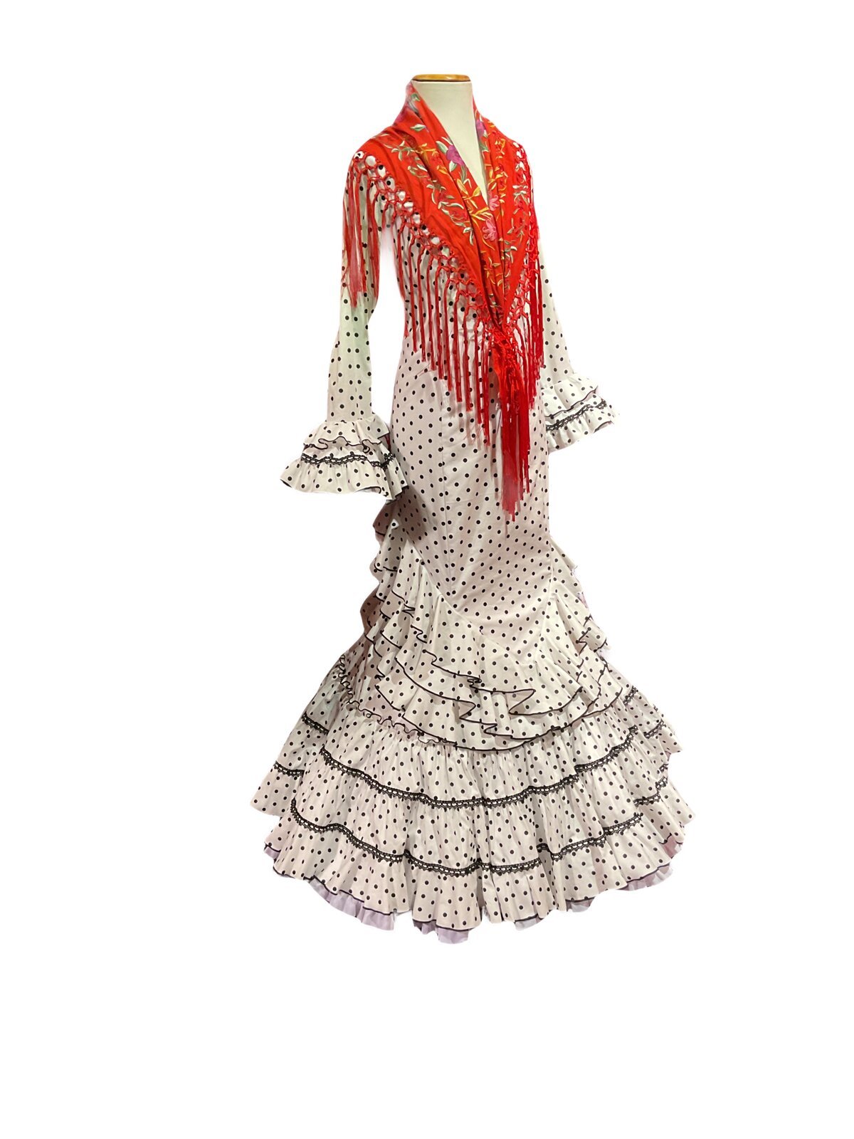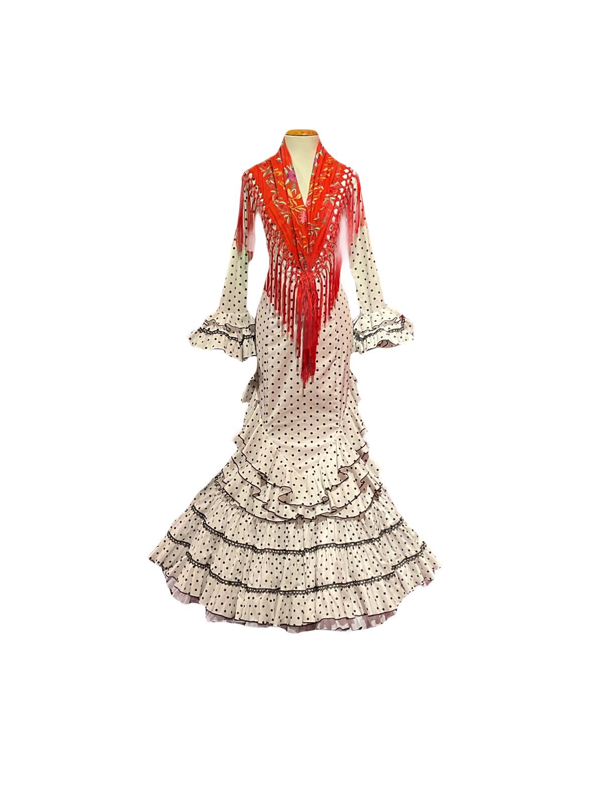 Vestido enterizo de falda canastera con volantes que suben en la cadera . Mangas largas con volantes en el puño. Escores delantero y trasero en pico.
