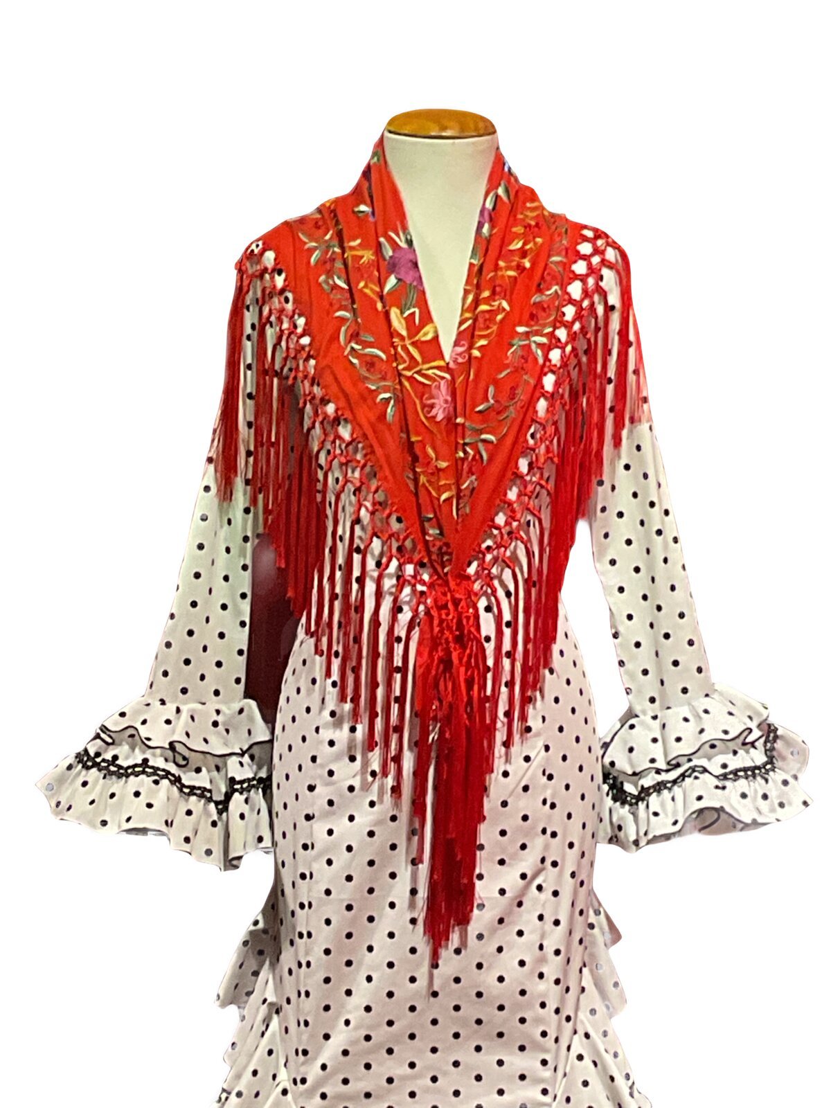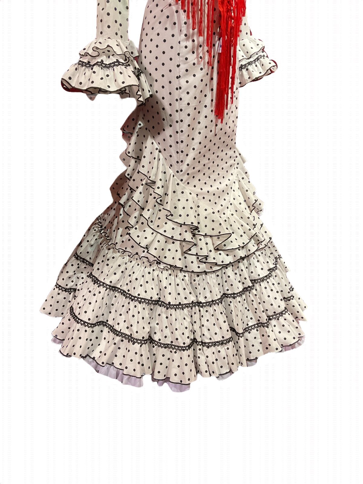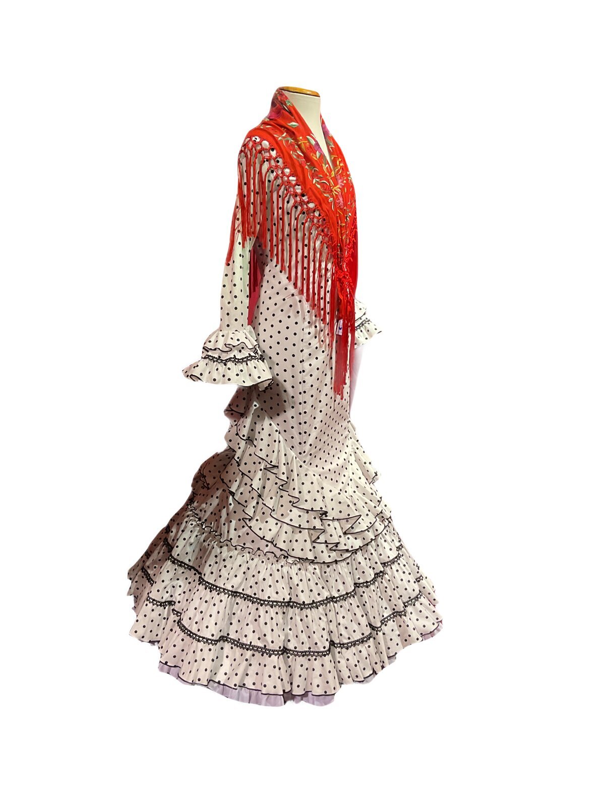 Vestido enterizo de falda canastera con volantes que suben en la cadera . Mangas largas con volantes en el puño. Escores delantero y trasero en pico.