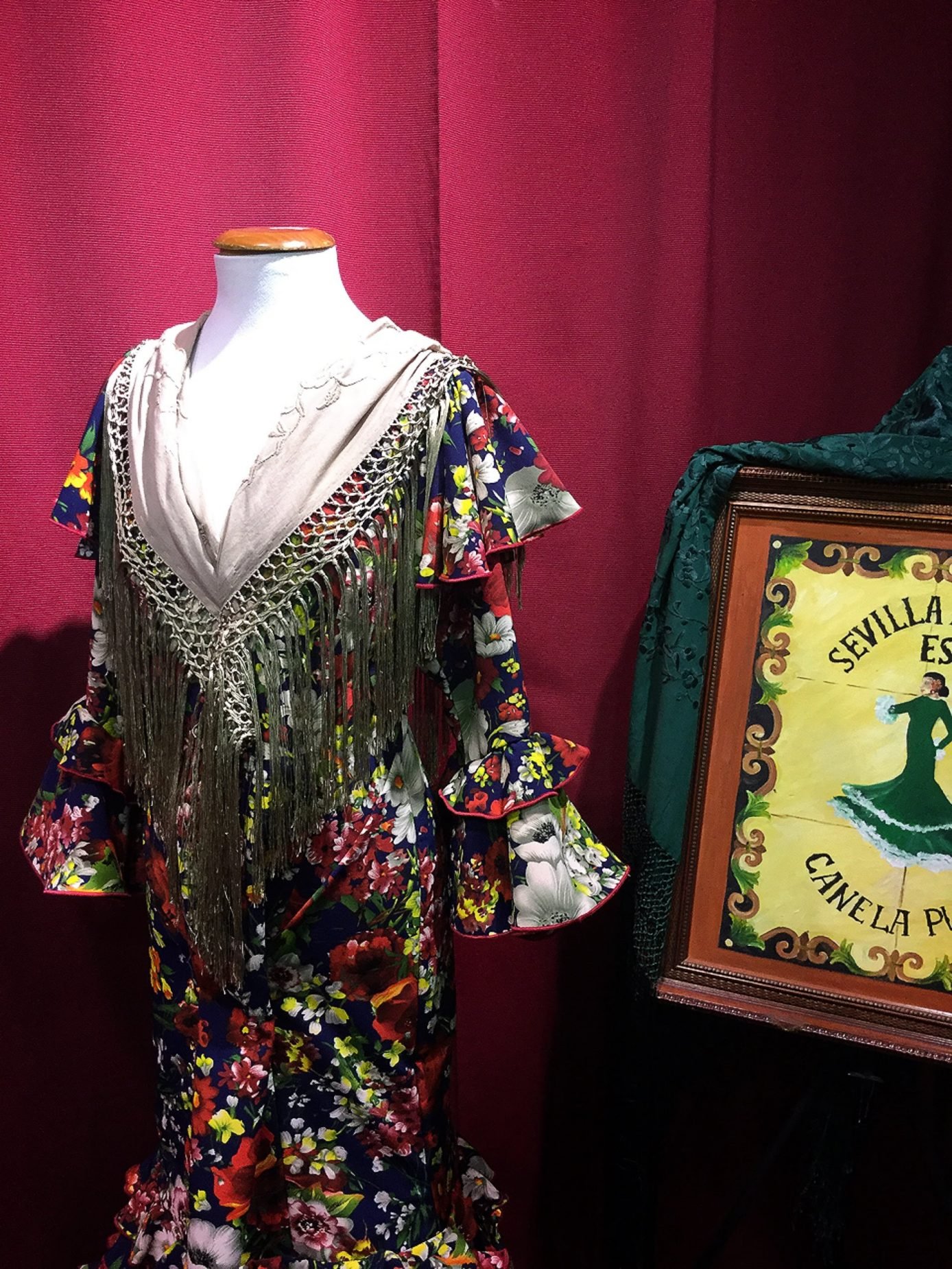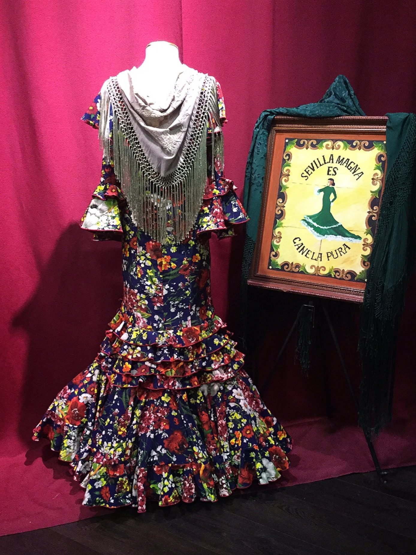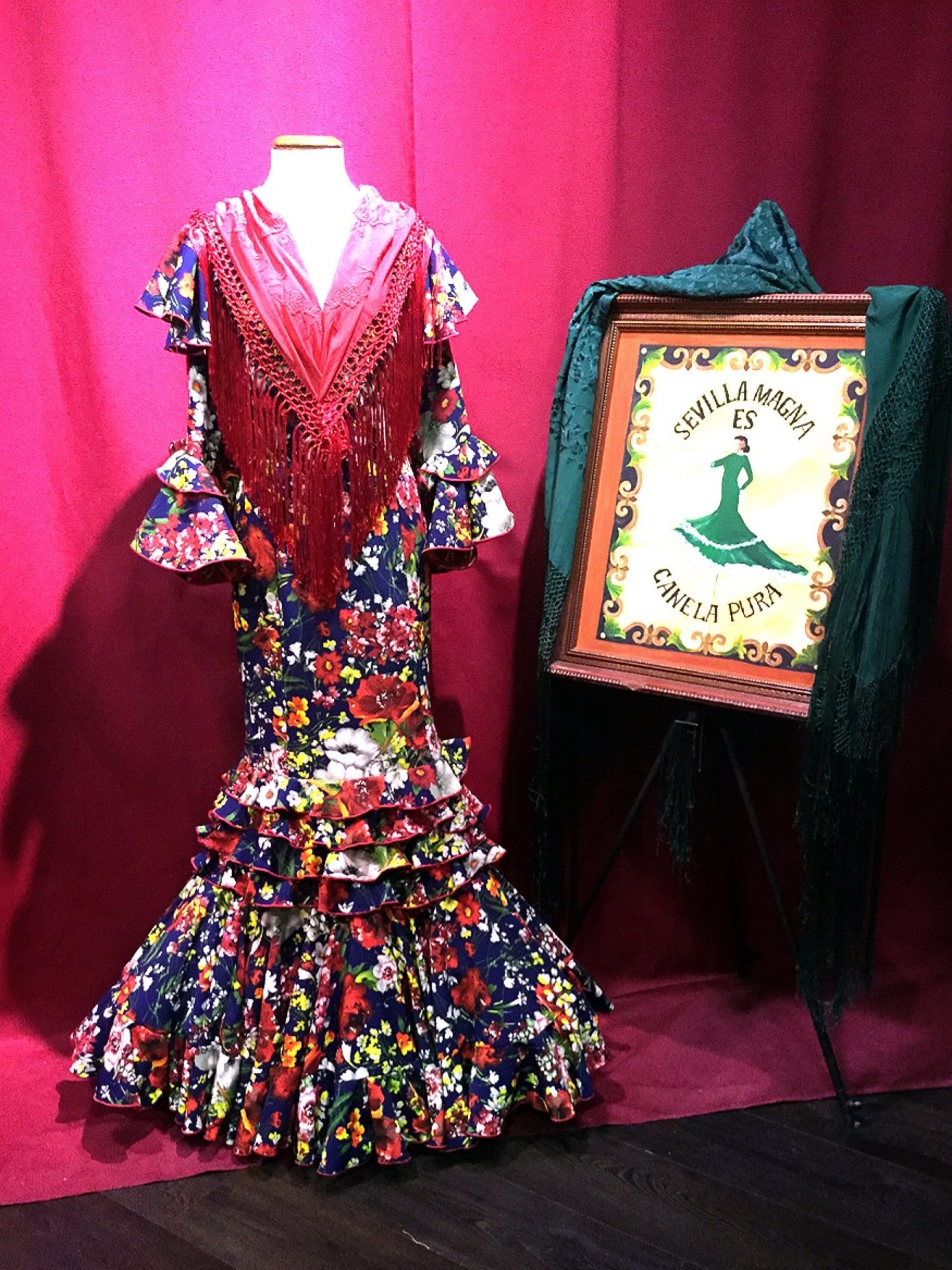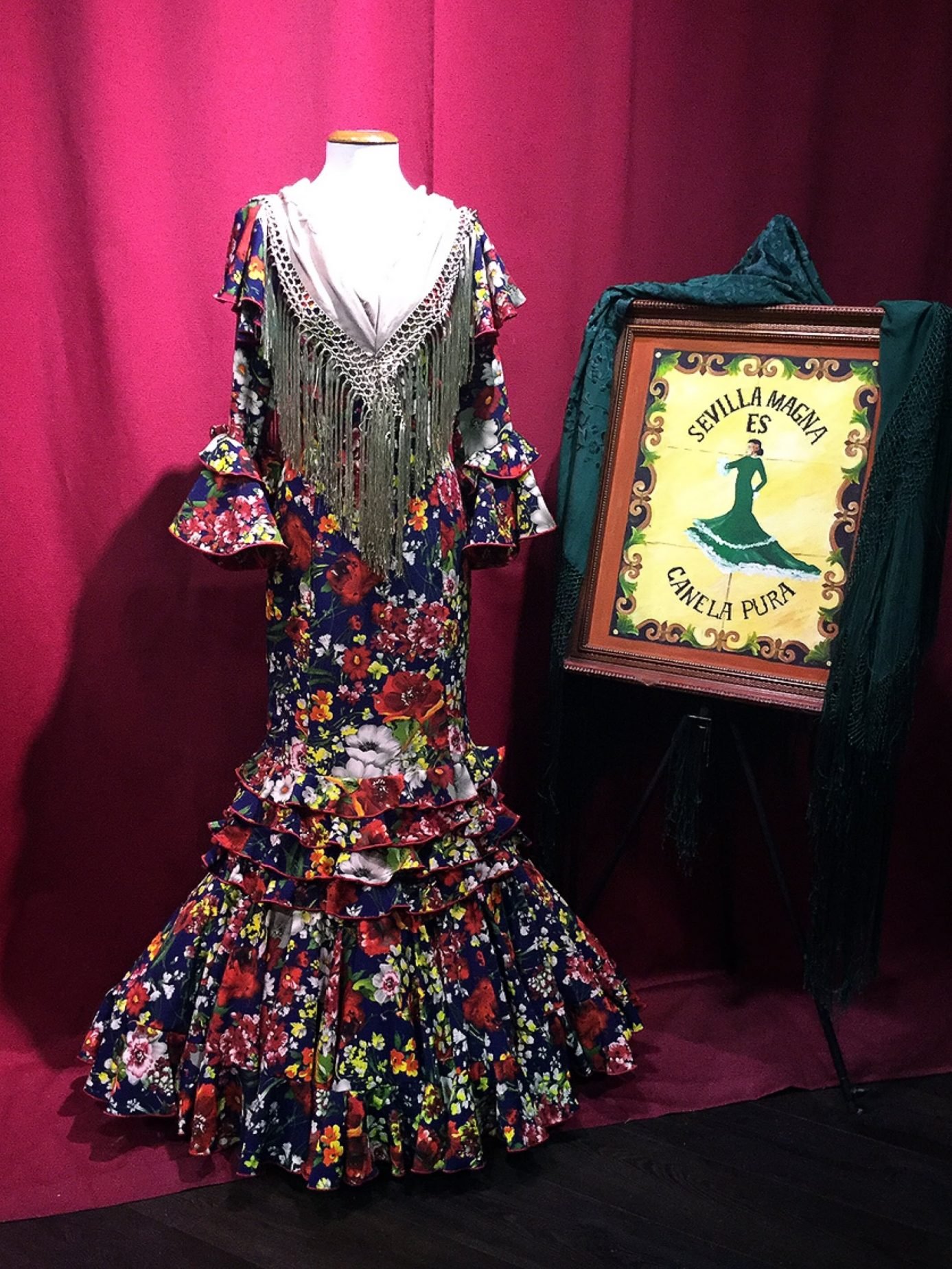 Vestido muy ligero de peso, con un talle largo a media pierna, varios volantes en su falda, y original manga con volantes en el hombro. Tejidos con caída. Disponible en varios colores. Para ferias y romerías.