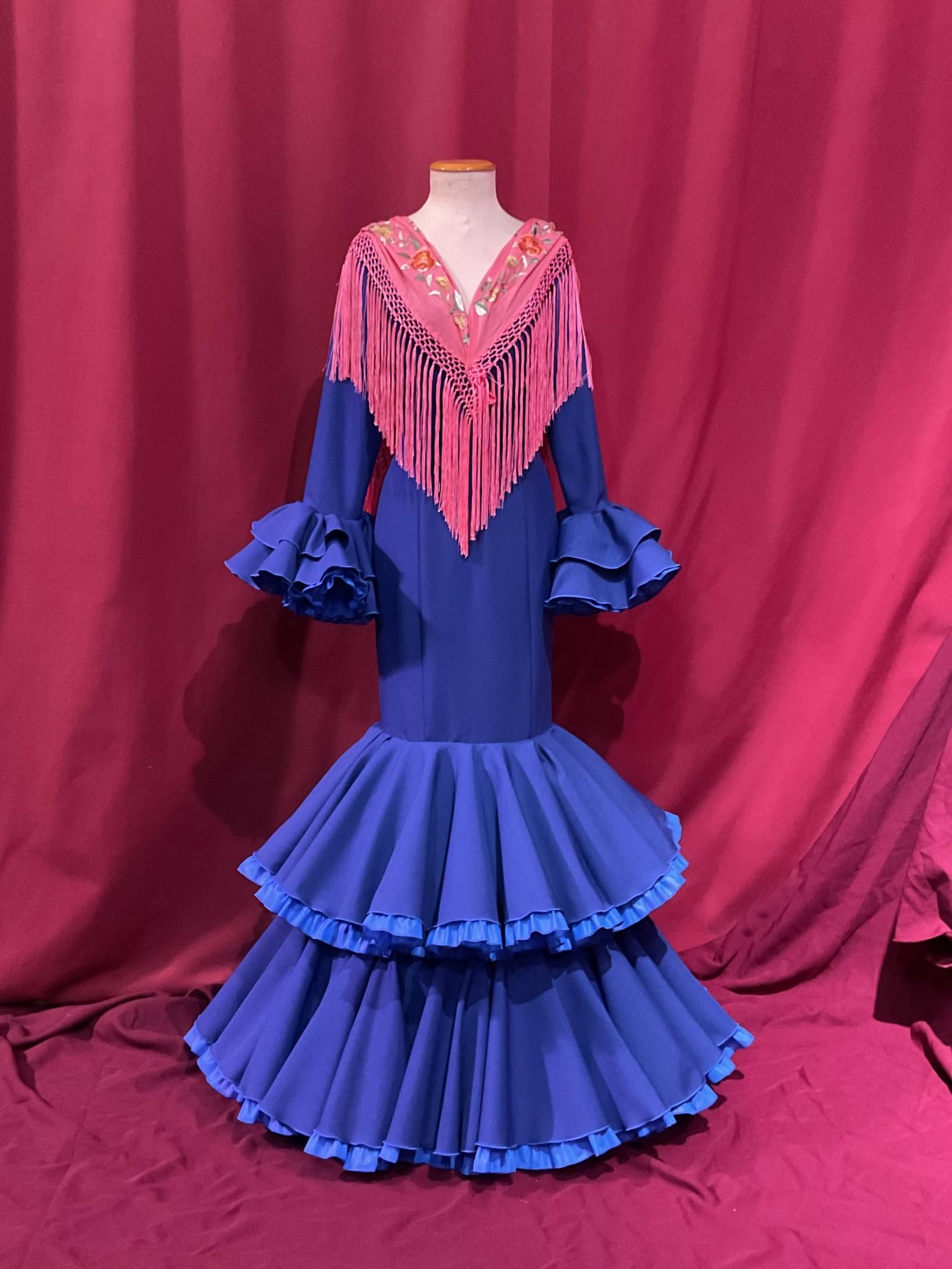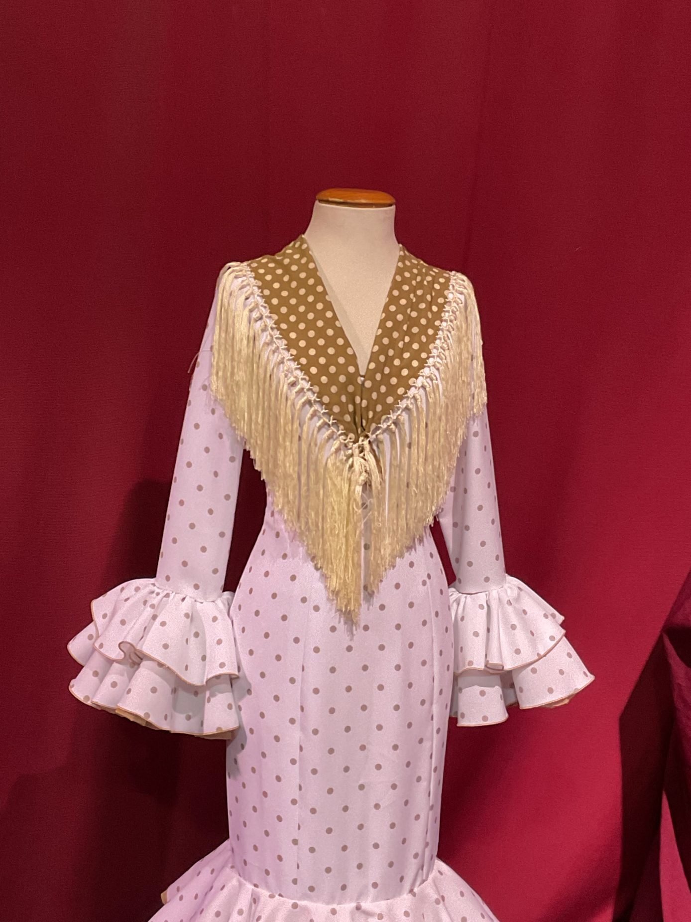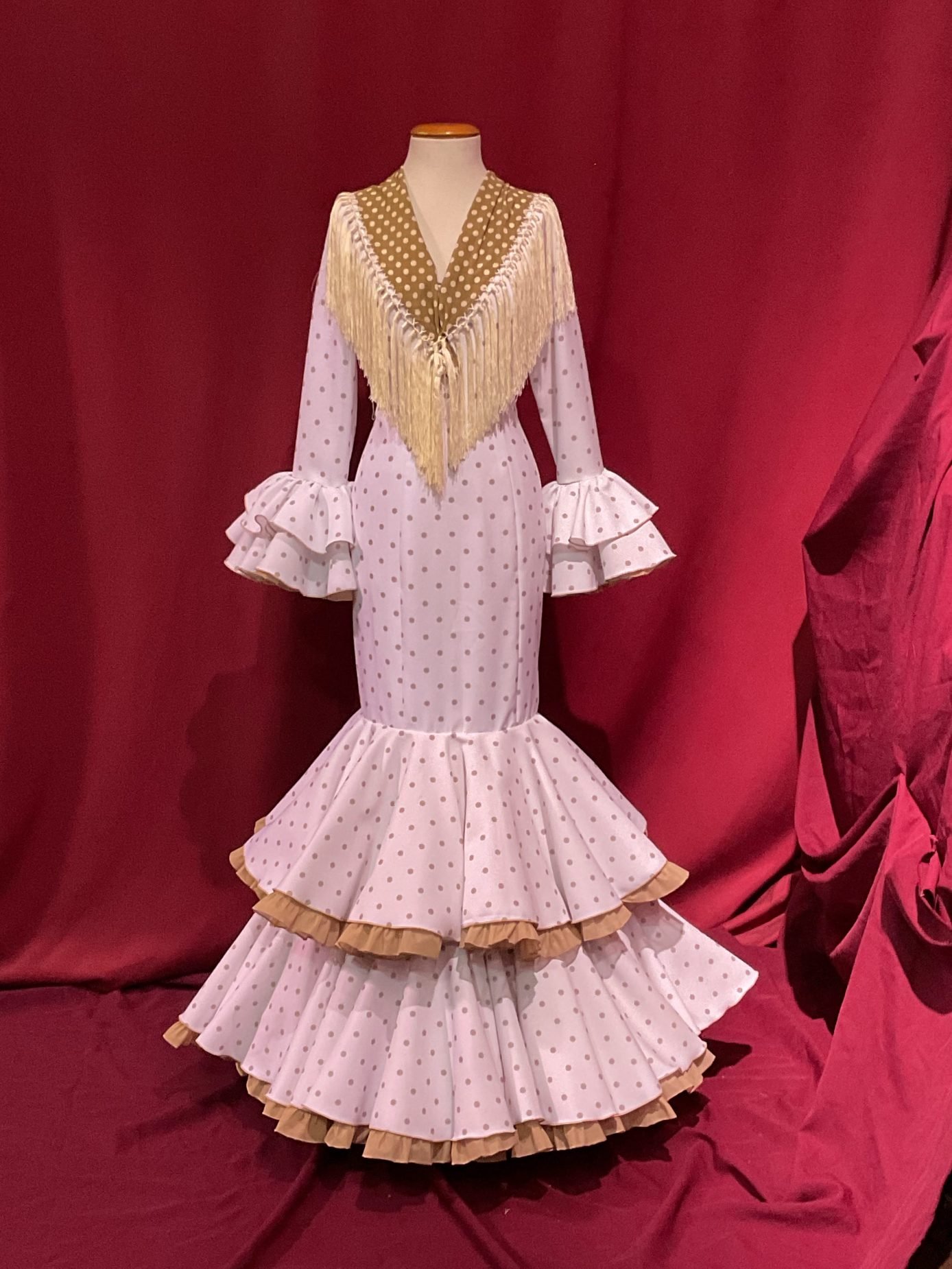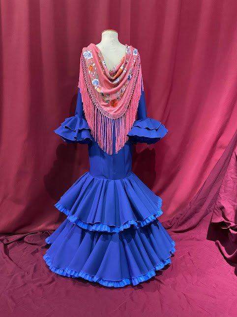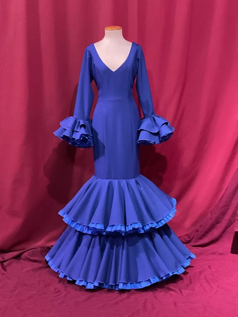 Modelo entallado con 2 volantes de capa dobles con can can y adorno luna . Con mucho volumen en la falda efecto clavel. Amplios escotes de pico delantero y trasero. Manga larga con volantes en su puño.