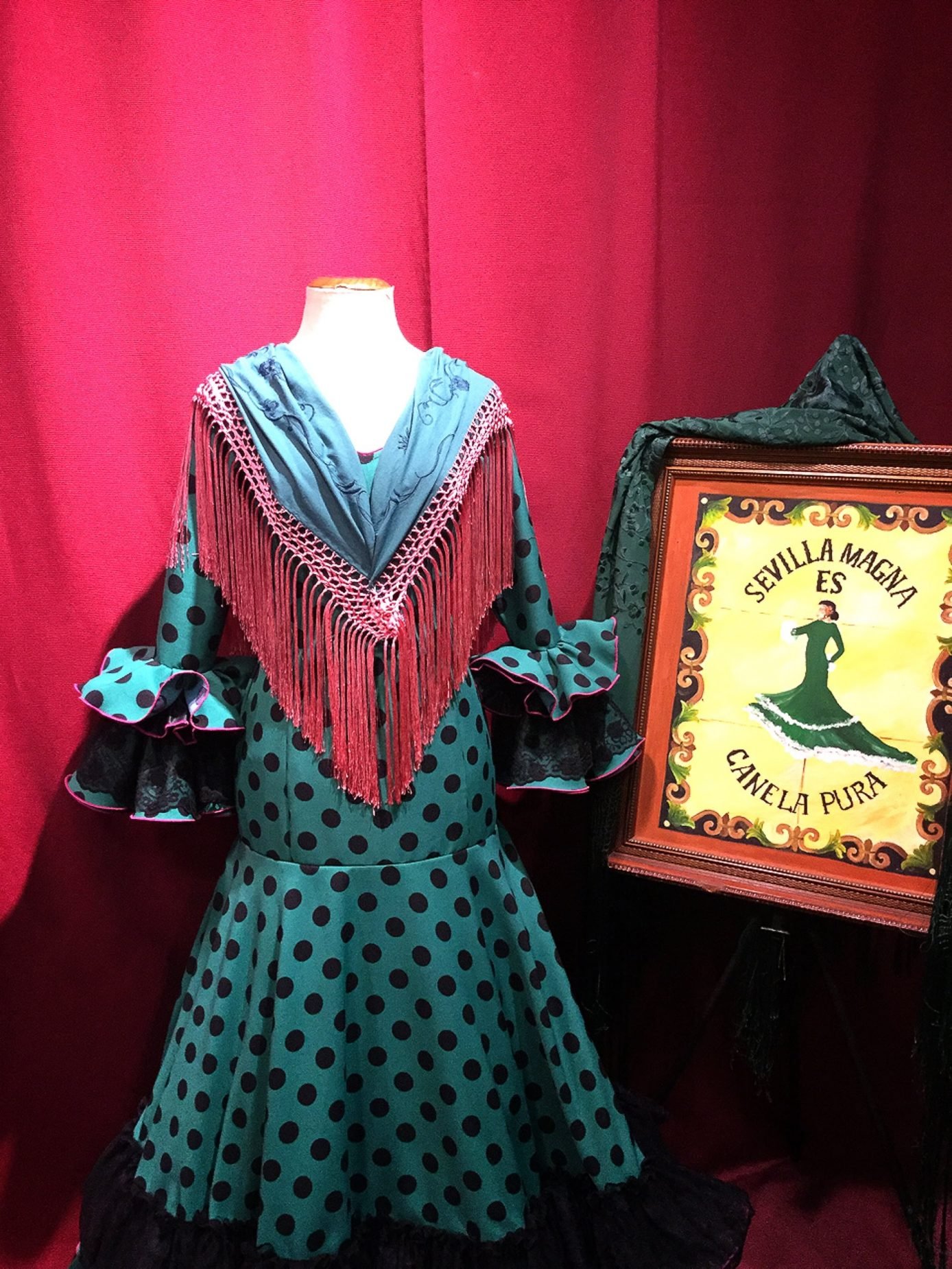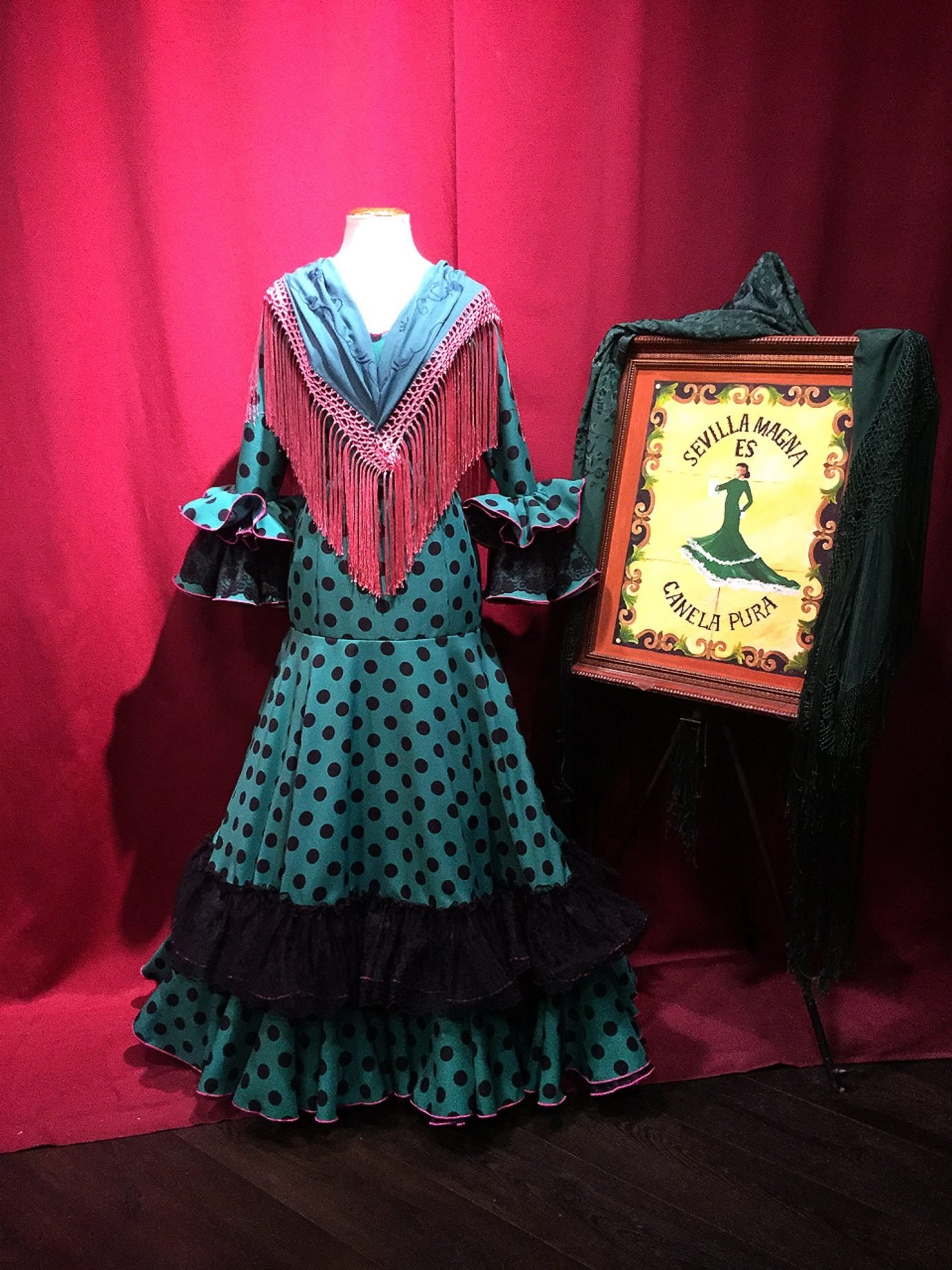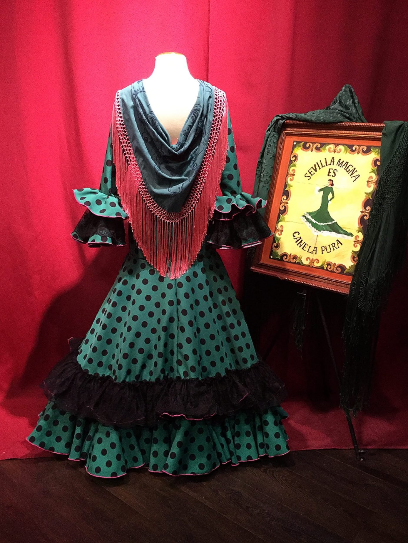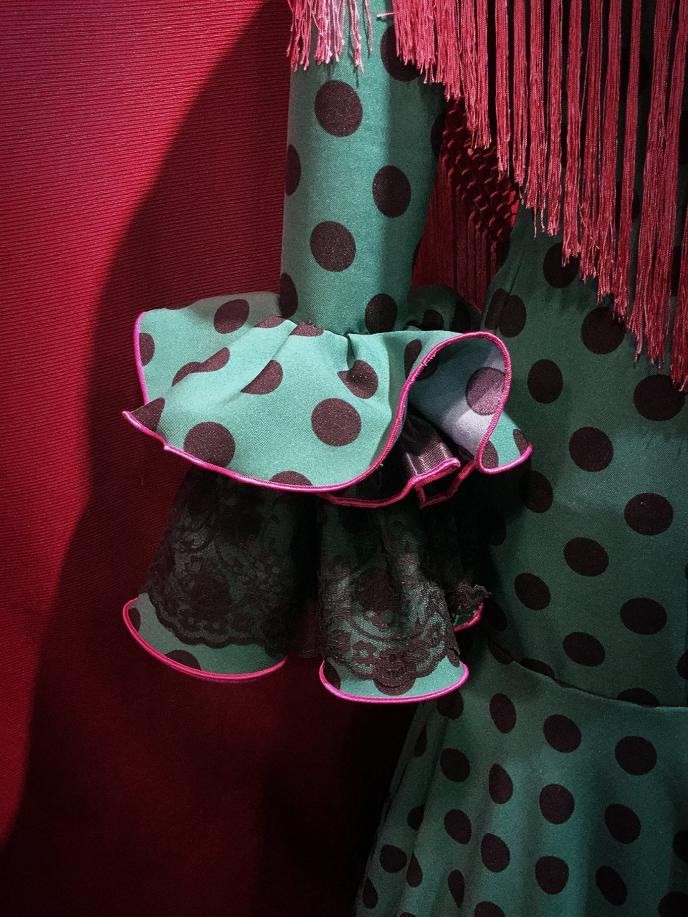 Vestido cortado al talle en la cadera, confeccionado en strecht , ancho encaje en la falda y mangas. Disponible en varios colores, para uso en ferias y romerías.
