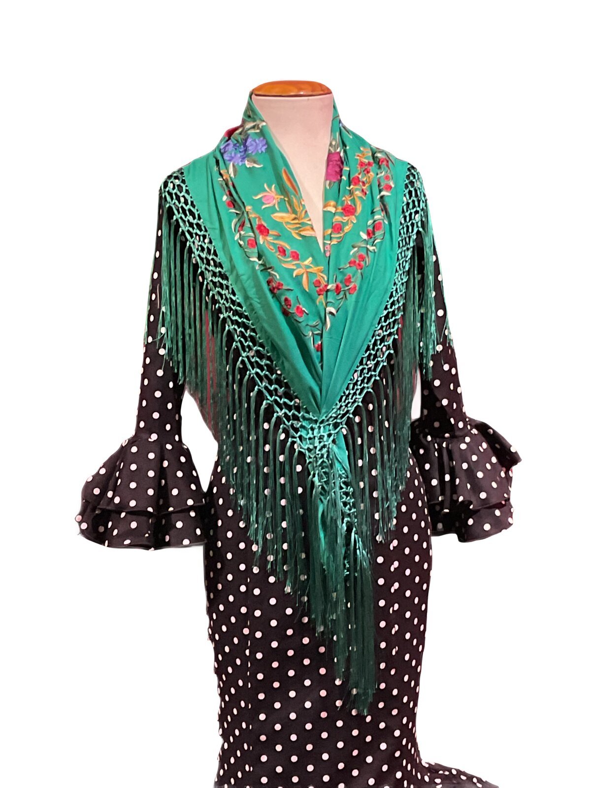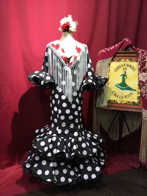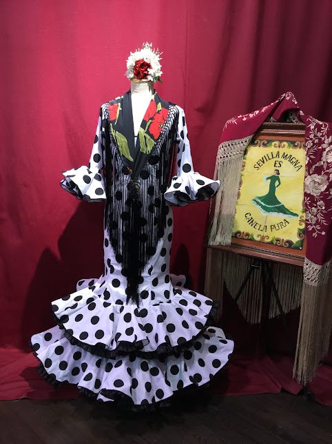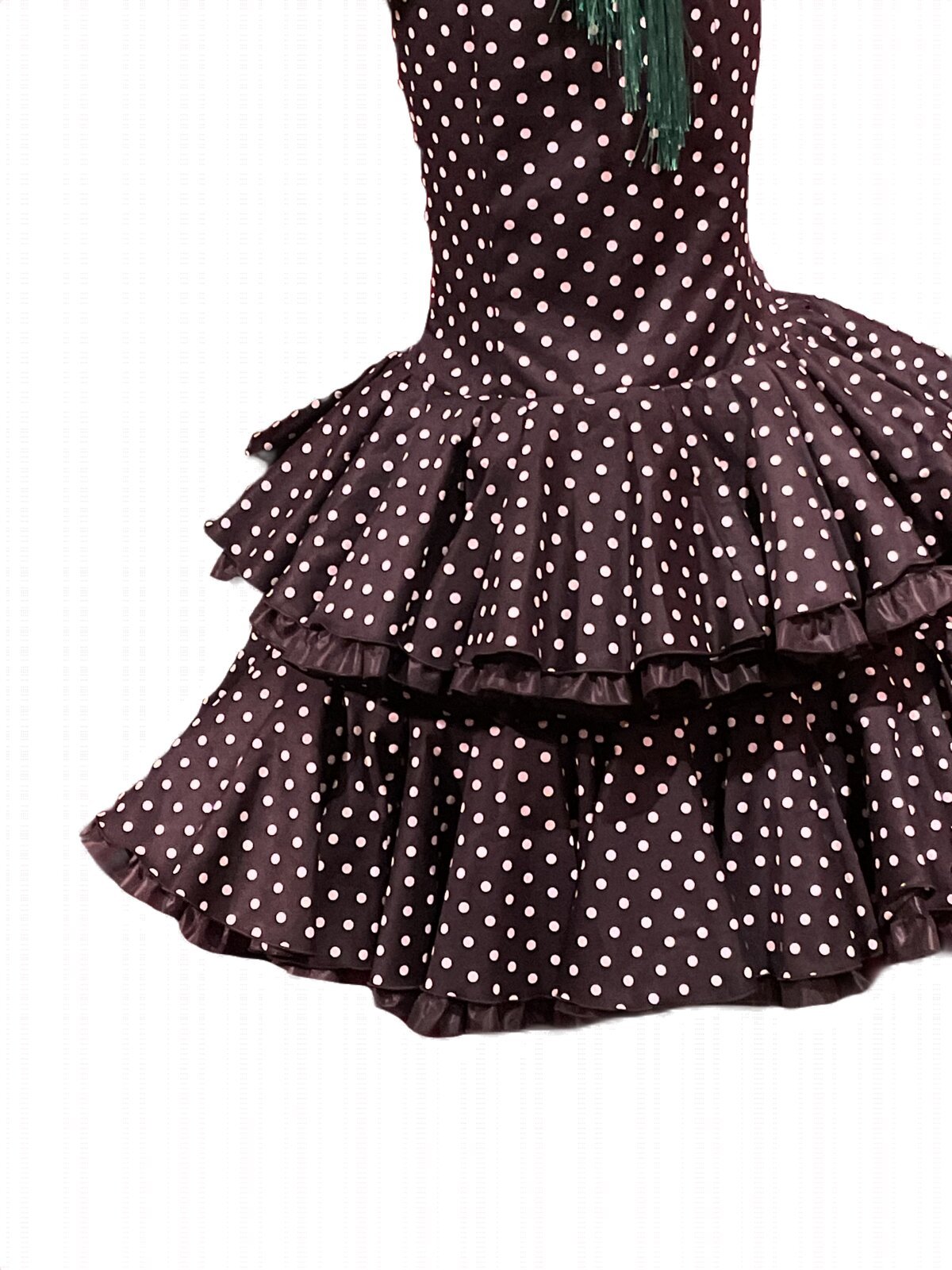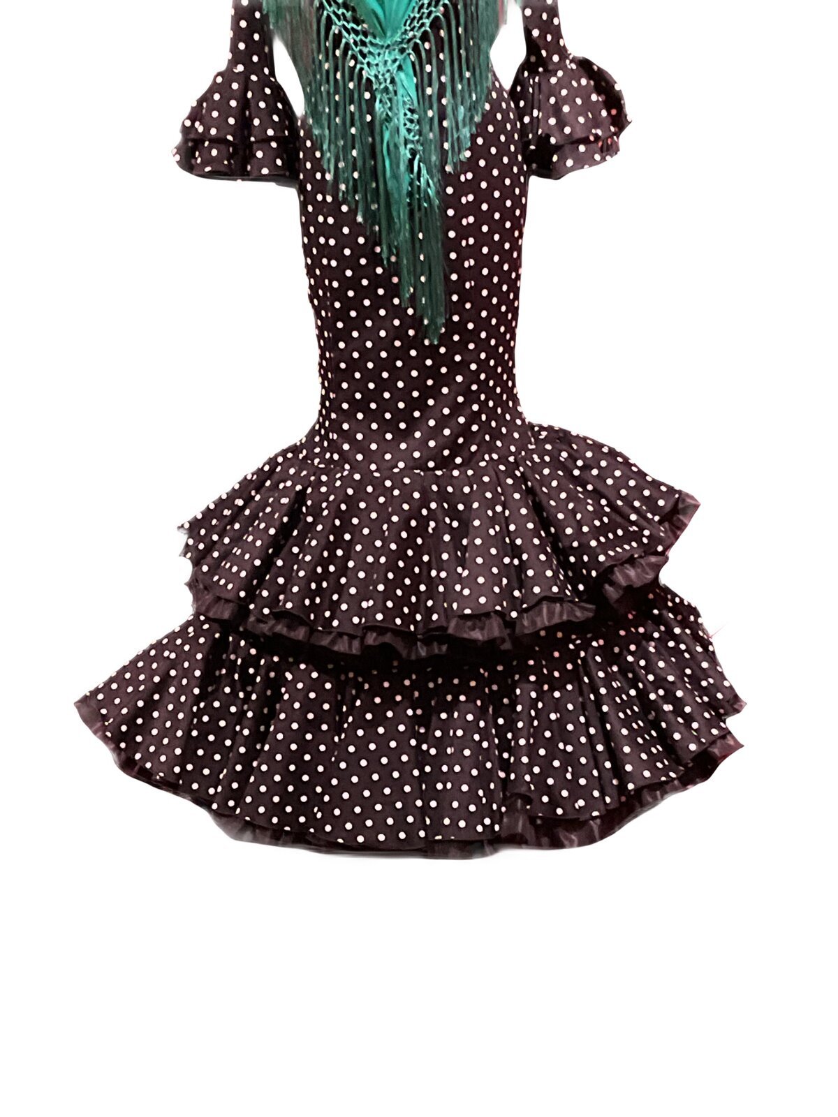 Modelo enterizo entallado con 2 volantes dobles en el bajo de la falda elevado con volante de can can y adorno luna. Manga larga con volantes en el puño.