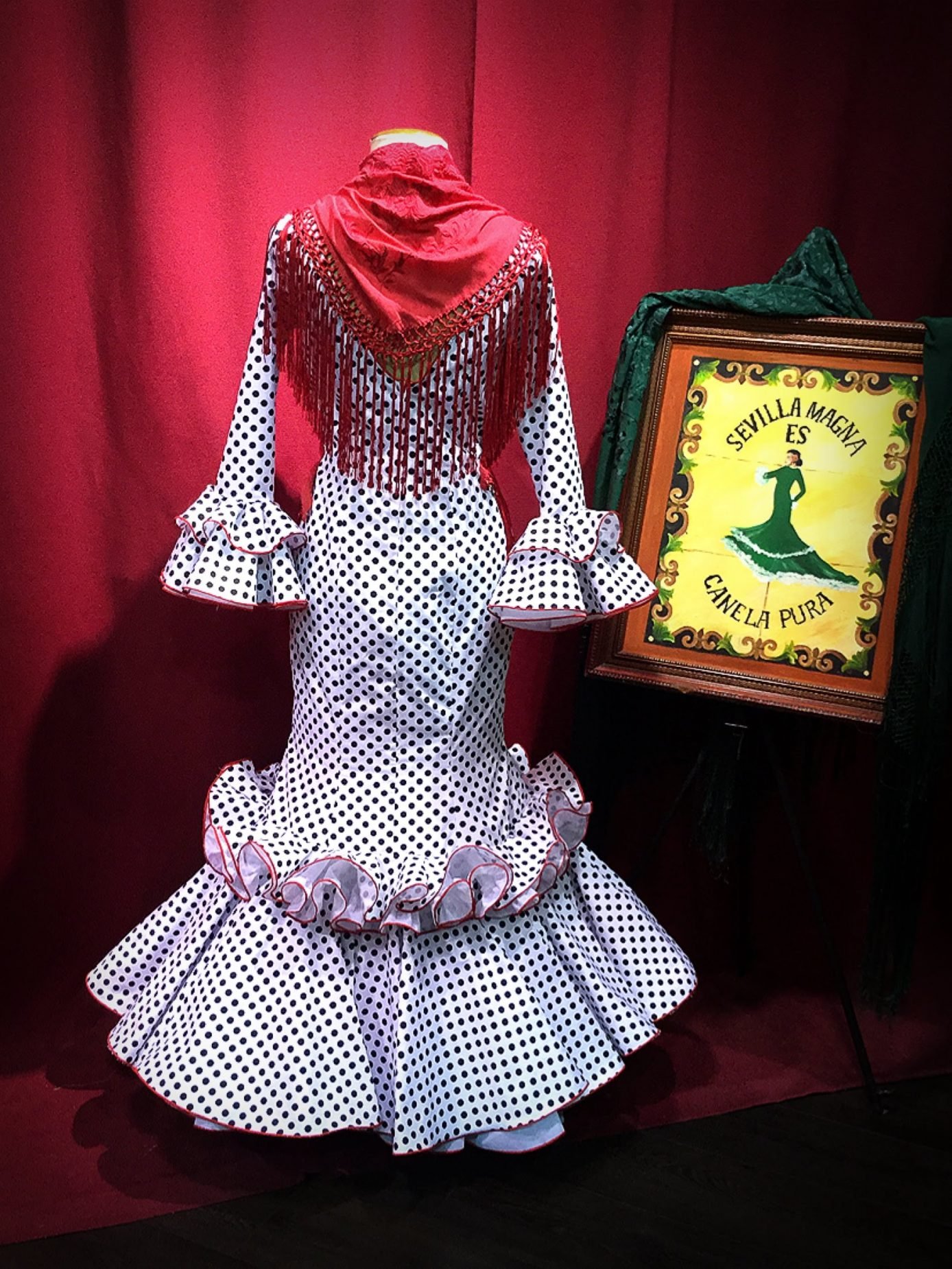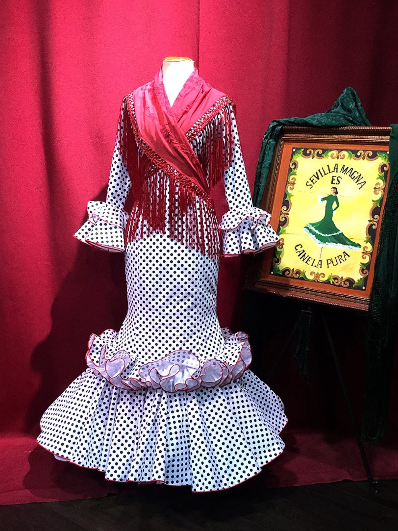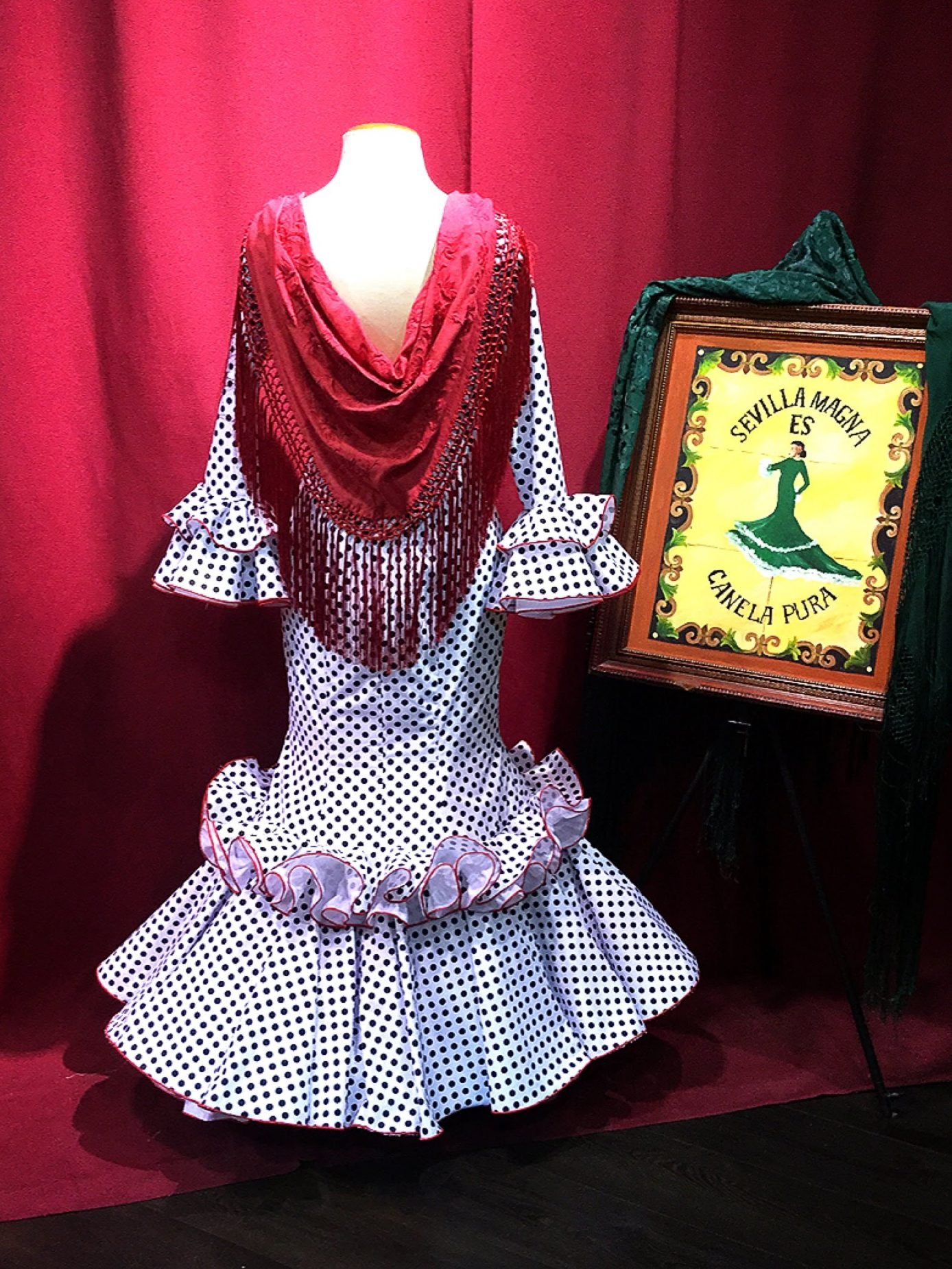 Vestido de corte sirena, con volante doble en el talle , manga larga con volantes al puño, escotes delantero y trasero de pico, propio para feria y para romería. Disponible en varios colores.
