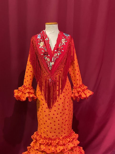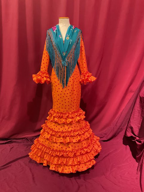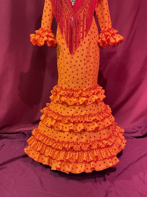 Vestido enterizo con volantes repartidos en la falda combinado en dos telas de capa y fruncidos . Manga francesa con volantes en el puño, escotes de pico.